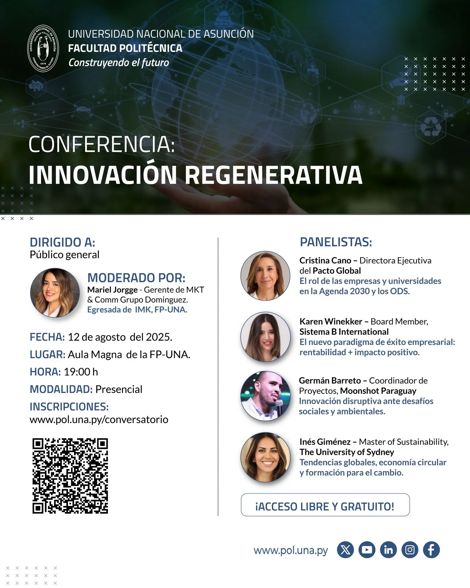 La Facultad Politécnica de la Universidad Nacional de Asunción (FP-UNA), a través de su iniciativa UNA Conectada, invita a estudiantes, docentes, empresarios, emprendedores y público en general al panel internacional titulado “Innovación Regenerativa: Empresas Sostenibles”, que se realizará el martes 12 de agosto a las 19:00 horas en el Aula Magna de la FP-UNA, campus San Lorenzo.