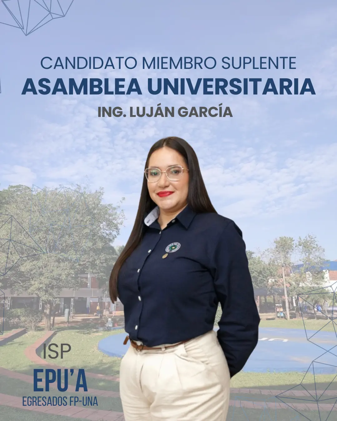 ¡Hola! Soy Luján García, egresada de la carrera Ingeniería en Sistemas de Producción y candidata a miembro suplente de la Asamblea Universitaria, por el estamento de Graduados de la FP-UNA.